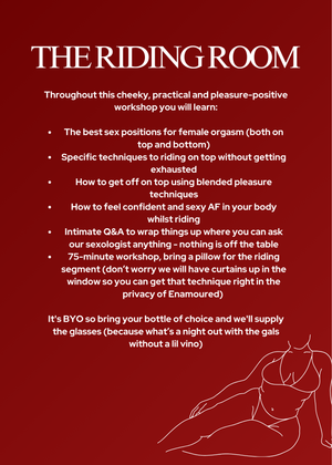 Our Enamoured Sexologist, Melissa Vranjes is back for another iconic workshop - this time we're entering “The Riding Room”.